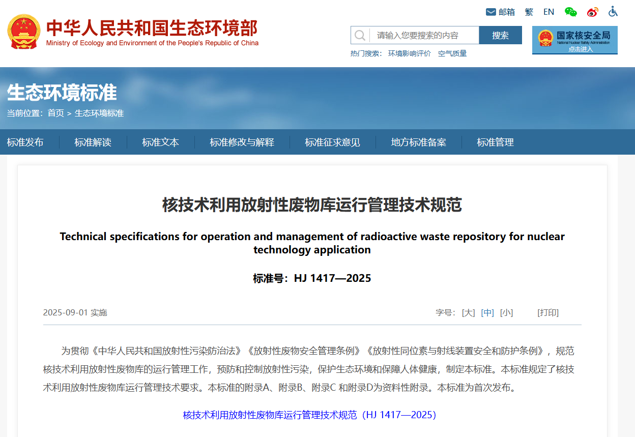 核技術利用放射性廢物庫運行管理技術規范(HJ 1417—2025)