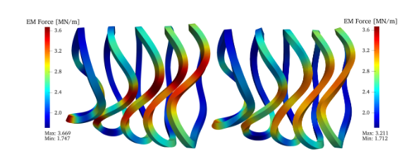 圖1:Wendelstein 7-X仿星器原始線圈(左)與優化后(右)的單位長度電磁力分布。在不影響其他參數的情況下,最大單位長度電磁力最大降低了12.5%,線圈整體電磁力下降了8.4%。