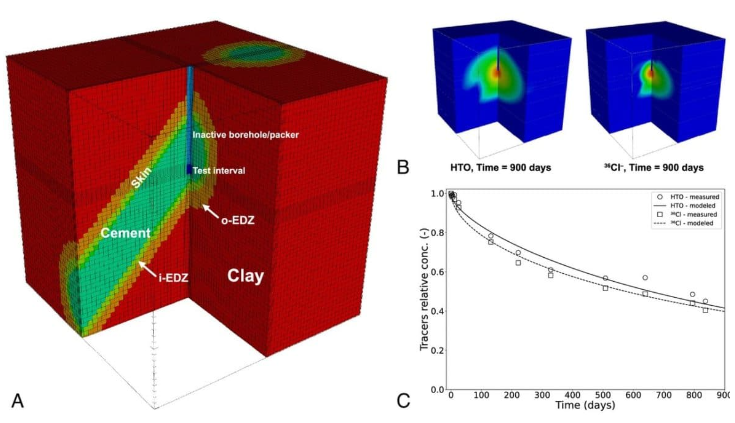 科學(xué)家在三維空間中模擬這一過程,基于著名的CrunchFlow軟件開發(fā)了CrunchODiTi程序,借助該程序分析了放射性核素進(jìn)入粘土 - 水泥混合物后近三年的實(shí)驗(yàn)結(jié)果。他們將帶正電和負(fù)電的離子分別添加到位于地層水泥附近的井中。