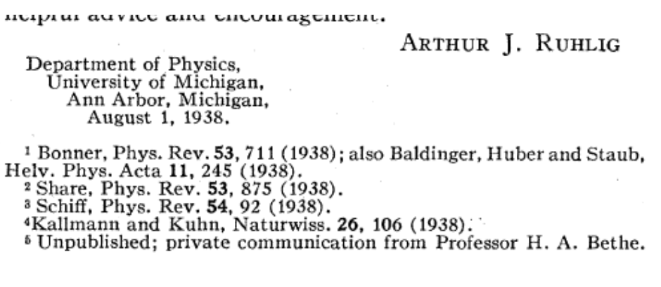 那么,這篇論文有沒(méi)有受到當(dāng)時(shí)科學(xué)家的關(guān)注呢?答案是肯定的。首先,論文所發(fā)表的《物理評(píng)論》(Physical Review)期刊是物理學(xué)家最常閱讀的期刊(甚至沒(méi)有之一);其次,論文的最后一篇參考文獻(xiàn)是作者和漢斯·貝特的私人信件,這說(shuō)明漢斯·貝特對(duì)論文必然是知情的。