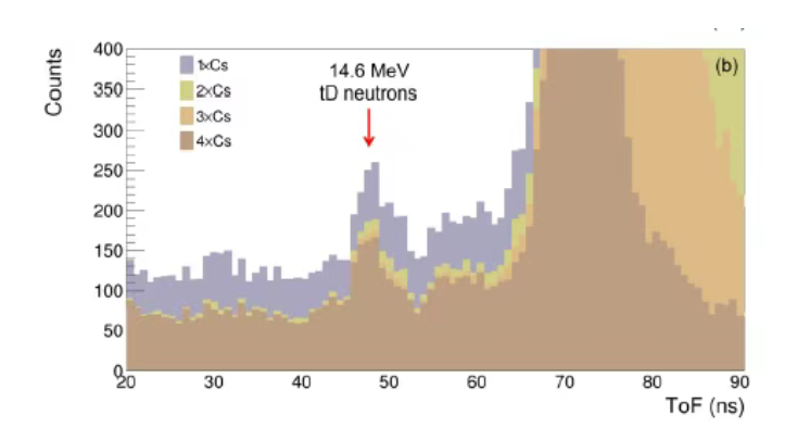 通過(guò)對(duì) TOF 數(shù)據(jù)的分析,研究團(tuán)隊(duì)最終確認(rèn),實(shí)驗(yàn)中產(chǎn)生了高能中子(14.6MeV中子)形成了異常顯著的峰,這表明在實(shí)驗(yàn)中確實(shí)出現(xiàn)了次級(jí)反應(yīng)——氘氚聚變。