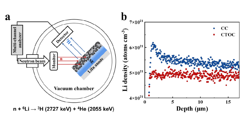 近日,中國原子能科學研究院與清華大學深圳國際研究生院 依托中國先進研究堆,利用中子深度剖面分析(Neutron Depth Profiling, NDP)技術 ,精準揭示了全固態鋰電池傳統單層正極(CC)的關鍵缺陷,首次通過實驗直接觀測并定量證實了顯著的縱向鋰濃度梯度 ,在電極厚度方向上實現了鋰濃度的均勻分布, 為梯度電極核心設計工作提供了有力的實驗依據,為推動全固態鋰電池基礎科學認知及其工程化應用作出重要貢獻。