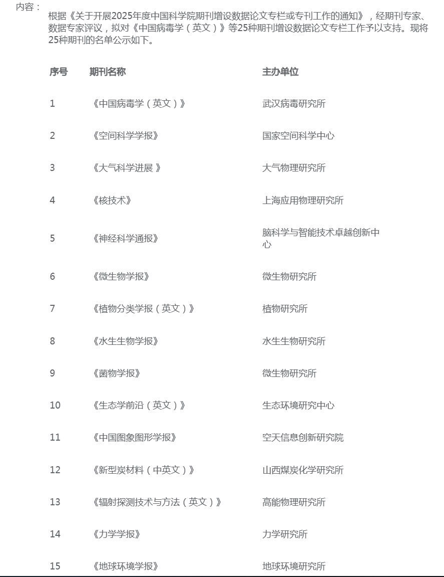 中國科學院以“優中選強,引領發展”為原則,面向其主管的學術期刊開展遴選工作,涵蓋已發表數據論文的期刊、計劃增設數據論文專欄的期刊以及純數據論文期刊。經過嚴格評審,《輻射探測技術與方法(英文)》憑借其在科學數據領域的深厚積累、卓越的學術影響力以及規范的出版流程,成功入選25種期刊名單(其中20為2025年度新入選期刊),積極助力輻射探測技術領域數據論文成果發表。