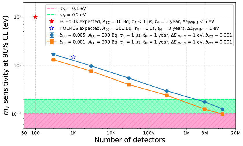 圖2:90%置信度中微子質量上限靈敏度隨探測器數量的變化(實驗參數見圖例)