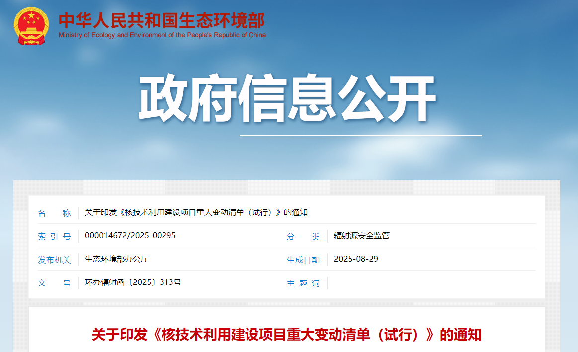 2025年8月29日,生態環境部辦公廳向各省、自治區、直轄市生態環境廳(局),新疆生產建設兵團生態環境局發布通知,印發《核技術利用建設項目重大變動清單(試行)》,要求遵照執行。