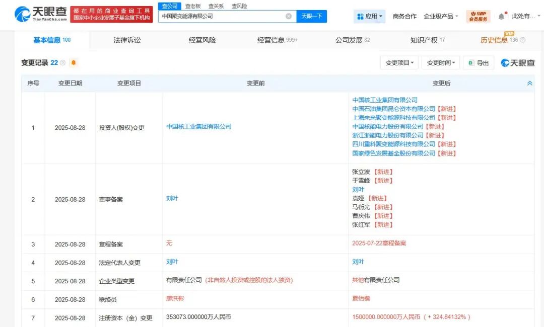 據(jù)公開消息顯示,近日,中國(guó)聚變能源有限公司發(fā)生工商變更,新增中國(guó)石油集團(tuán)昆侖資本有限公司、中國(guó)核電(601985)、浙能電力(600023)等為股東,注冊(cè)資本由約35.31億人民幣增至150億人民幣,增幅約325%,劉葉由董事變更為董事長(zhǎng),同時(shí),新增多位主要人員。
