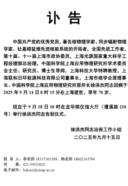 9月15日,中國科學院上海應用物理研究所發布訃告,中國共產黨的優秀黨員,著名核物理學家、同步輻射物理學家、釷基熔鹽堆先進核能系統的開拓者,全國先進工作者,第十屆、十一屆上海市政協委員,上海光源國家重大科學工程經理部總經理,中國科學院上海應用物理研究所學術委員會主任、研究員、博士生導師,上海科技大學特聘教授,上海聯和日環能源科技有限公司董事長,上海市核學會原理事長、中國科學院上海應用物理研究所原所長徐洪杰同志因病于2025年9月14日8時15分在上海逝世,享年70歲。