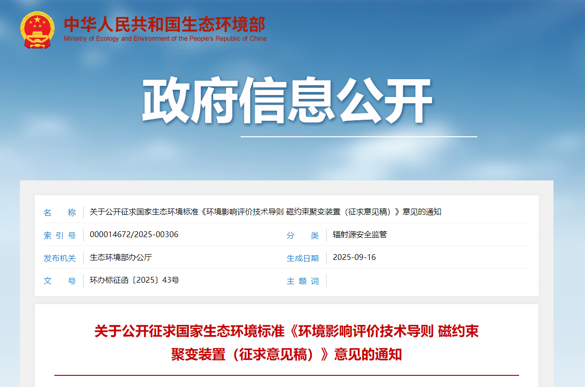9月15日,生態(tài)環(huán)境部辦公廳發(fā)布通知,就國家生態(tài)環(huán)境標(biāo)準(zhǔn)《環(huán)境影響評價(jià)技術(shù)導(dǎo)則 磁約束聚變裝置(征求意見稿)》公開征求意見。