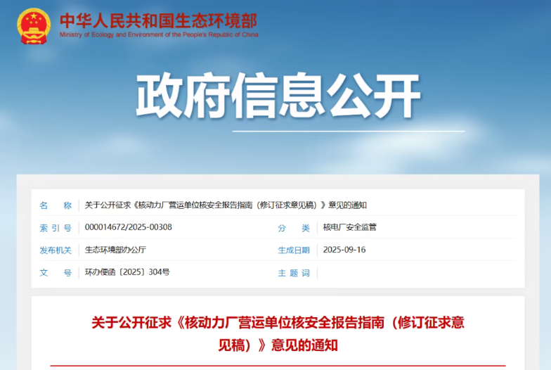 9月16日,生態環境部就《核動力廠營運單位核安全報告指南(修訂征求意見稿)》對外征求意見指出,隨著近幾年核安全監管形勢的不斷發展,結合各單位在運用2020年發布的《核動力廠營運單位核安全報告指南》(以下簡稱《報告指南》)的過程中遇到的實際問題,對《報告指南》進行完善修訂: 一是體現從嚴監管的原則。當前我國核電處于規模化建設期,有必要督促營運單位落實核安全主體責任,加強經驗反饋,及時報告相關問題;二是以《報告指南》現行版本為基礎,維持整體框架不變;三是針對《報告指南》使用中遇到問題,進一步細化、明確報告準則,確保準則更具可操作性,避免分歧;四是借鑒美國、法國等國最新監管實踐,并充分考慮國內實際情況,優化事件報告準則。