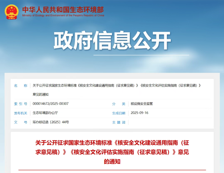 關于公開征求國家生態環境標準《核安全文化建設通用指南(征求意見稿)》《核安全文化評估實施指南(征求意見稿)》意見的通知