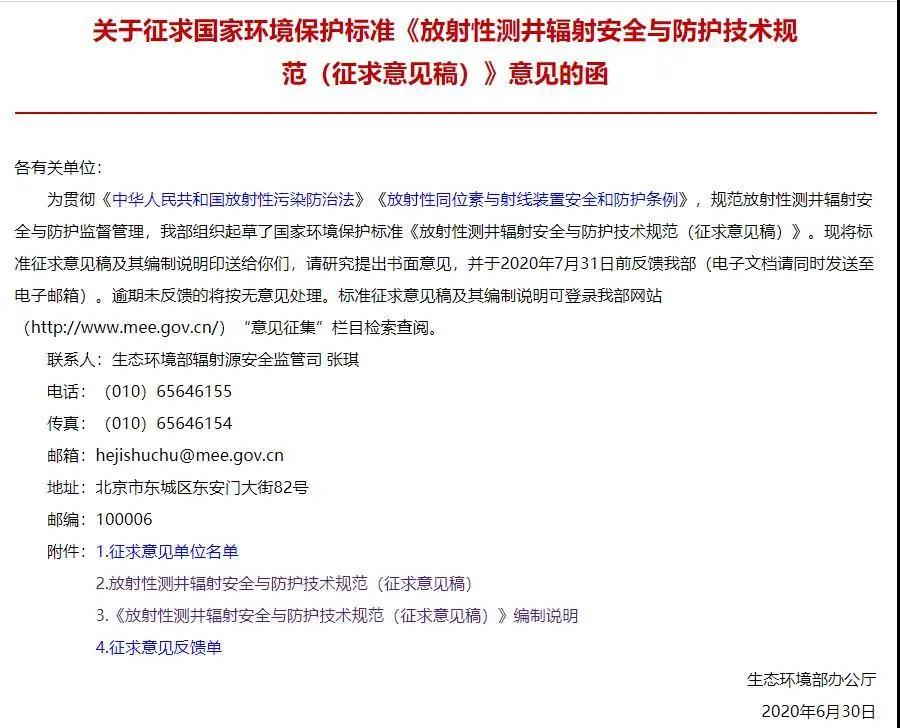 2020年7月8日,國家生態環境部發布公告,公開征求國家環境保護標準《放射性測井輻射安全與防護技術規范(征求意見稿)》(以下簡稱“規范”)意見。