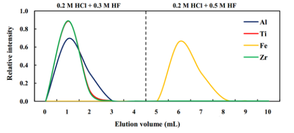中國科學院廣州地球化學研究所穩定同位素地球化學學科組博士生朱冠虹和高級工程師馬金龍等,通過一系列條件實驗,對不同巖性的巖石標樣的淋洗曲線進行標定,開發出一種快速、高效的鐵同位素分析方法。該分析方法僅采用1柱AGMP-50陽離子交換樹脂,先用0.2 N HCl+0.3N HF作為淋洗液去除Al及其他高場強元素(HFSE),再用0.2 N HCl+0.5N HF作為淋洗液接收Fe,可以將Fe和其他基體元素(Al、Na、Mg、K、Ca、Cu等)完全分離開(如圖)。