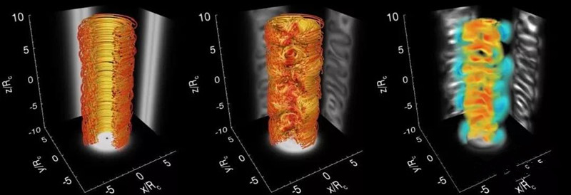 在模擬小型宇宙射流的過程中,SLAC的研究人員發(fā)現(xiàn),當(dāng)射流的螺旋磁場(左)被強烈扭曲時,磁場線(中)變得高度糾結(jié),在射流內(nèi)部產(chǎn)生一個大電場(右),可以有效地將電子和質(zhì)子加速到極值能量。圖片:arXiv:1810.05154v1