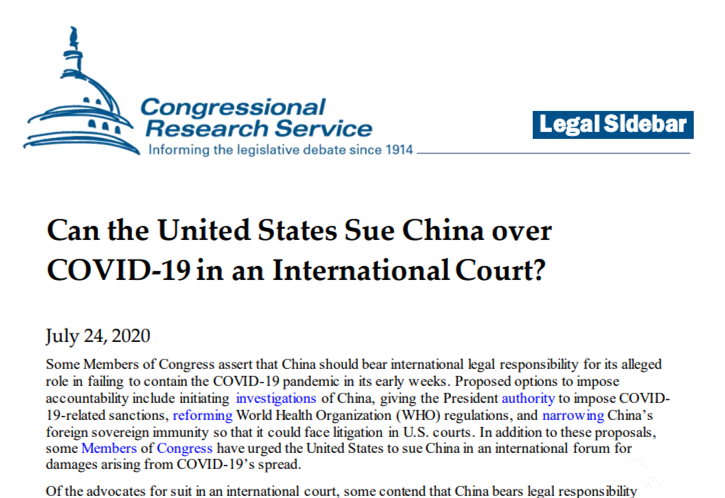 一些國會議員聲稱,中國應(yīng)因其在最初幾周未能遏制COVID-19大流行的作用而承擔(dān)國際法律責(zé)任。提出的追究責(zé)任的方案包括:啟動對中國的調(diào)查、賦予總統(tǒng)權(quán)力實施與COVID-19相關(guān)的制裁、改革世界衛(wèi)生組織(WHO)的規(guī)定、縮小中國的對外主權(quán)豁免權(quán)范圍,使其可以在美國法院面臨訴訟。除了這些建議外,一些國會議員還敦促美國在國際論壇上起訴中國,要求賠償因COVID-19的傳播而造成的損失。