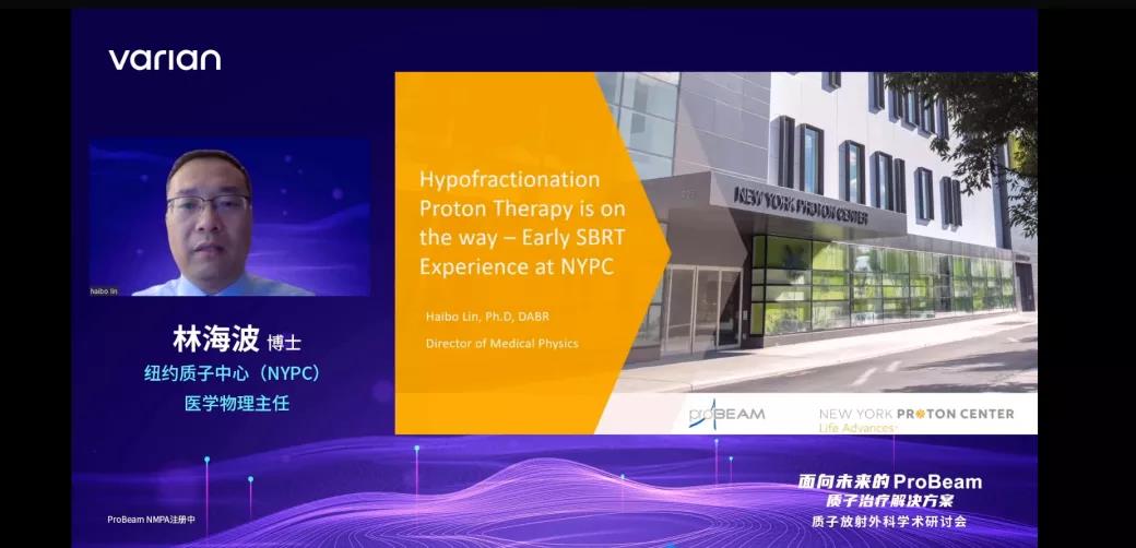 紐約質子中心醫學物理主任林海波博士做了題為《大分割質子放療:紐約質子中心放射外科治療技術分享》的演講。紐約質子中心在第一間治療室交付后短短幾個月的時間里已經治療了幾百名患者,并且開展了幾十例的質子放射外科治療。