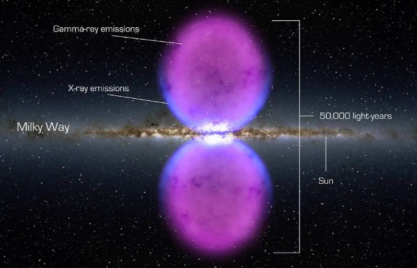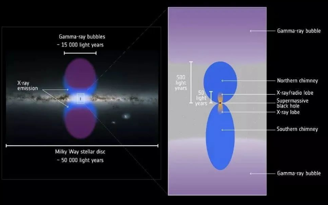 費米氣泡是兩個巨大的氣泡,充滿了非常熱的氣體、宇宙射線和磁場。雖然肉眼看不到它們,但它們伽馬射線發射中非常明亮。在伽馬射線中,費米氣泡的邊緣形狀看上去非常“鋒利”,邊緣與一種稱為銀河中心雙錐X射線結構的X射線結構非常吻合,其研究發表在《天體物理學》期刊上。看到費米氣泡的邊緣與銀河系中心雙錐X射線結構非常相似,上海天文臺研究人員意識到這些結構可能具有相同的起源。