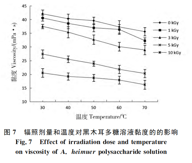 圖7顯示不同溫度條件下輻照處理黑木耳多糖溶液的黏度。黑木耳多糖溶液黏度受輻照劑量 和 溫 度 影 響 較 大,輻 照 劑 量 增 大 黑木耳多糖 溶 液 黏 度 降 低;在 實 驗 設(shè) 定 的 溫 度范圍內(nèi),溫 度 增 高,黑木耳多糖溶液的黏度降低。