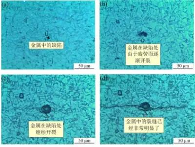 ▲顯微鏡觀測到的金屬缺陷及起始于該缺陷的金屬疲勞開裂過程