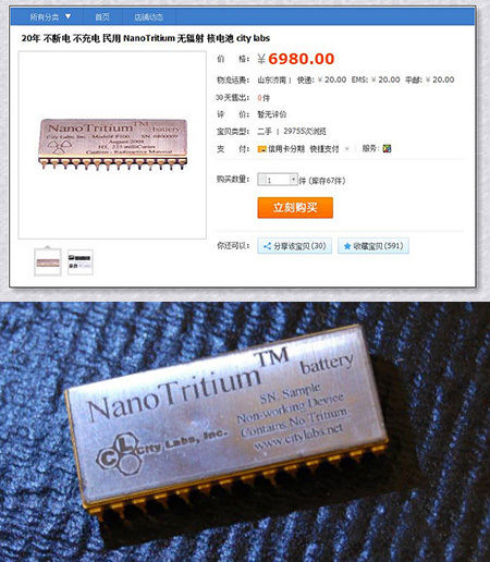 但它并非完全一無是處。同樣,某寶 2012 年的時候就出現過一款氚電池,號稱 20 年不斷電、不充電,一小塊電池的價格達到了近 7000 元,可謂是天價。這款名為 NanoTritium 的電池并不是什么山寨產品,而是貨真價實的首款可商用氚電池,來自美國公司 City labs。