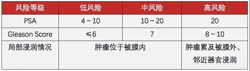 前列腺癌根治治療的對象為無骨轉(zhuǎn)移和無淋巴轉(zhuǎn)移的前列腺癌患者。在前列腺癌中,以腫瘤標(biāo)志物PSA值和腫瘤惡性度指標(biāo)格里森評分(Gleason Score)等方面因素,表示治愈、復(fù)發(fā)、轉(zhuǎn)移可能性的風(fēng)險分類如下圖。無骨轉(zhuǎn)移和無淋巴轉(zhuǎn)移的前列腺癌雖然都是根治性的治療對象。但是,PSA值極高的情況下,潛在轉(zhuǎn)移的可能性就會增加,有可能不建議行根治治療。