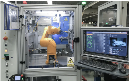 集成商根據(jù)凱毅德公司所提需求,設(shè)計(jì)建造了機(jī)器人檢測單元。由緊湊的史陶比爾TX60六軸機(jī)器人執(zhí)行關(guān)鍵任務(wù),其中包括在X射線室的檢測過程中處理組件。首先攝像機(jī)引導(dǎo)六軸機(jī)器人從一個(gè)工件支架上取下門鎖組件,每個(gè)門鎖配有四個(gè)剛焊接好的組件,機(jī)器人將門鎖組件傳送到測試單元中,將其呈現(xiàn)給攝像機(jī),攝像機(jī)讀取并記錄檢測報(bào)告的識(shí)別號(hào),同時(shí)檢查電線的顏色是否正確;然后機(jī)器人將門鎖組件轉(zhuǎn)移到X射線室,使用特殊夾具進(jìn)入密封的測試單元,防止測試期間輻射泄漏。記錄完第一張X射線圖像后,夾具將門鎖組件旋轉(zhuǎn)180度,然后拍攝第二張圖像。