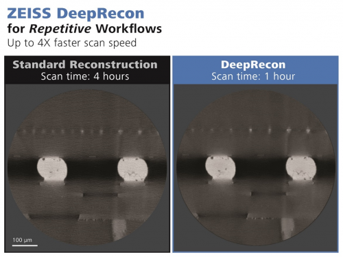 DeepRecon模塊利用定制訓練的神經網絡,在需要對相同或相似樣品進行重復性分析時,提高失效分析和結構分析的通量和成功率。蔡司針對特定類別的樣品,提供定制神經網絡并經優化后滿足客戶的需要。相比FDK,DeepRecon可在保持或提高圖像質量的情況下,使某些特定類別樣品的掃描時間最大縮短四倍,而且在掃描時間相同時,實現低噪音、高質量的圖像。在工作流程中應用DeepRecon網路模型是一件極其輕松的事情。工具操作員只需在下拉菜單中選擇蔡司開發的其中一種網絡模型即可。