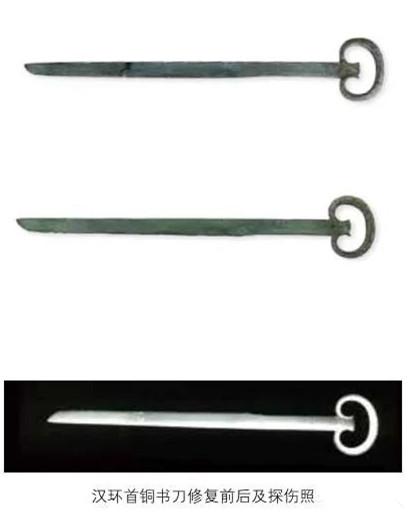 漢代文字主要書寫在竹簡、木簡上,寫錯的地方就要刮掉修改,削書刀就是用來刮削木簡、竹簡的。安徽固鎮縣博物館藏漢環首銅書刀通長22厘米,刃長20.5厘米,寬0.9厘米,厚0.648厘米,修復前一斷兩半,保存在無恒溫恒濕設備的文物庫房中。