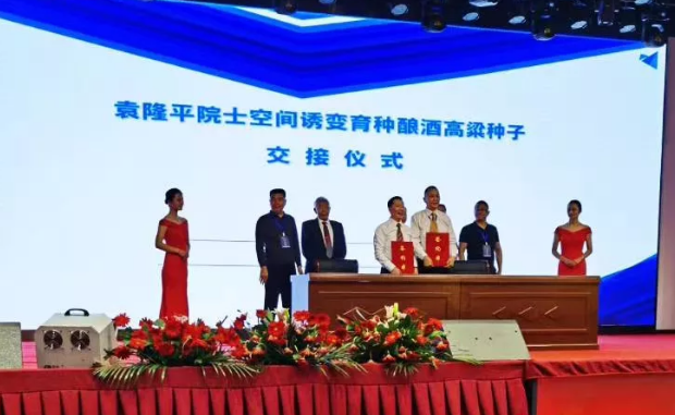 發(fā)布會(huì)現(xiàn)場(chǎng),與會(huì)領(lǐng)導(dǎo)嘉賓上臺(tái)共同見證,袁隆平院士代表將空間誘變育種釀酒高粱交接給黔國酒業(yè)集團(tuán)董事長(zhǎng)王運(yùn)萬手中;同時(shí),袁隆平院士團(tuán)隊(duì)湖南袁品農(nóng)業(yè)科技有限公司代表與王運(yùn)萬簽訂合作協(xié)議;同時(shí),共同為空間誘變育種釀酒高粱種植基地揭牌!