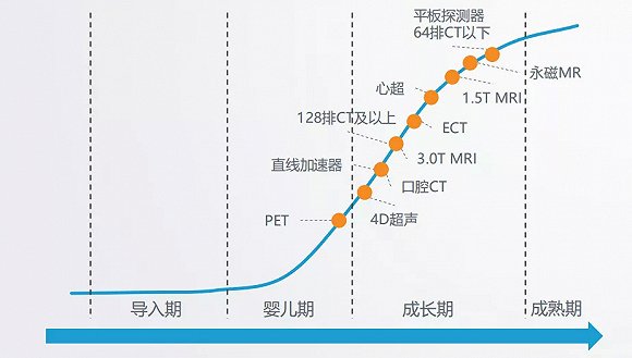 目前中國影像診斷技術比全球技術大約落后5-10年。據調查,目前國產醫療影像多項較前沿技術,除PET處于嬰兒期末期,大多數處于成長期,其中128排CT及以下平板探測器、永磁MRI等技術正逐漸向成熟期發展。