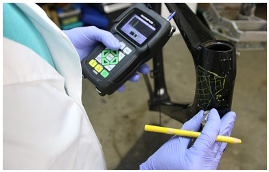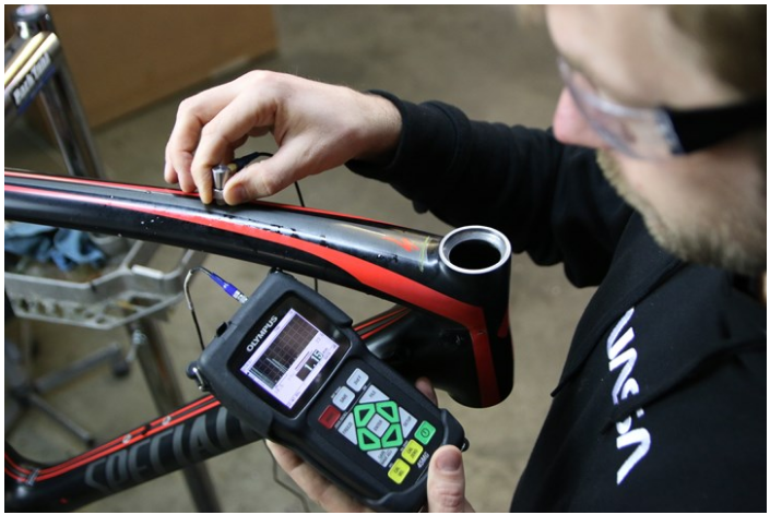 Ruckus Composites的所有者兼首席工程師Shawn Small用超聲波測厚儀在碳纖維自行車車架上進行檢查。 圖片 來源:Olympus