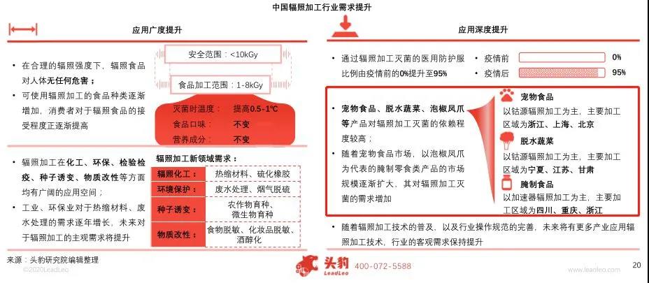 日前,頭豹研究院發(fā)布了一份《2020年中國輻照加工行業(yè)概覽》(以下簡稱報告),報告指出,中國輻照加工行業(yè)市場規(guī)模近年來保持高速增長,2019年,中國輻照加工行業(yè)市場規(guī)模達到17.5億元,未來隨著輻照加工范圍擴張,輻照產品需求提高,市場增速將加快,預計2024年市場規(guī)模可達46.2億元。其中,寵物食品對輻照加工滅菌技術的依賴程度較高,且隨著寵物食品市場規(guī)模逐漸擴大,其對輻照加工滅菌的需求也在逐年增加。