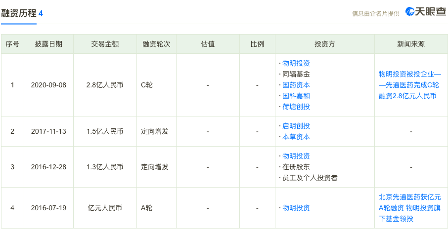 2016年7月,先通醫藥完成1億元A輪融資,物明投資旗下基金合計投資人民幣7000萬元,管理團隊同等估值跟投人民幣3000萬元。