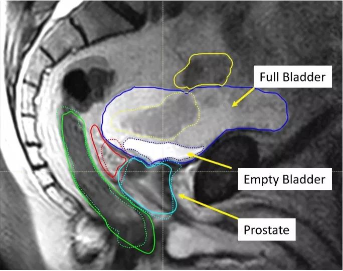 對于前列腺腫瘤而言,患者立位時(shí),膀胱充盈與膀胱排空情況下,前列腺的位置并無明顯變化,這對于治療是非常有利的,因?yàn)閷颊叨?,在治療期間持續(xù)維持膀胱充盈狀態(tài)并非易事。