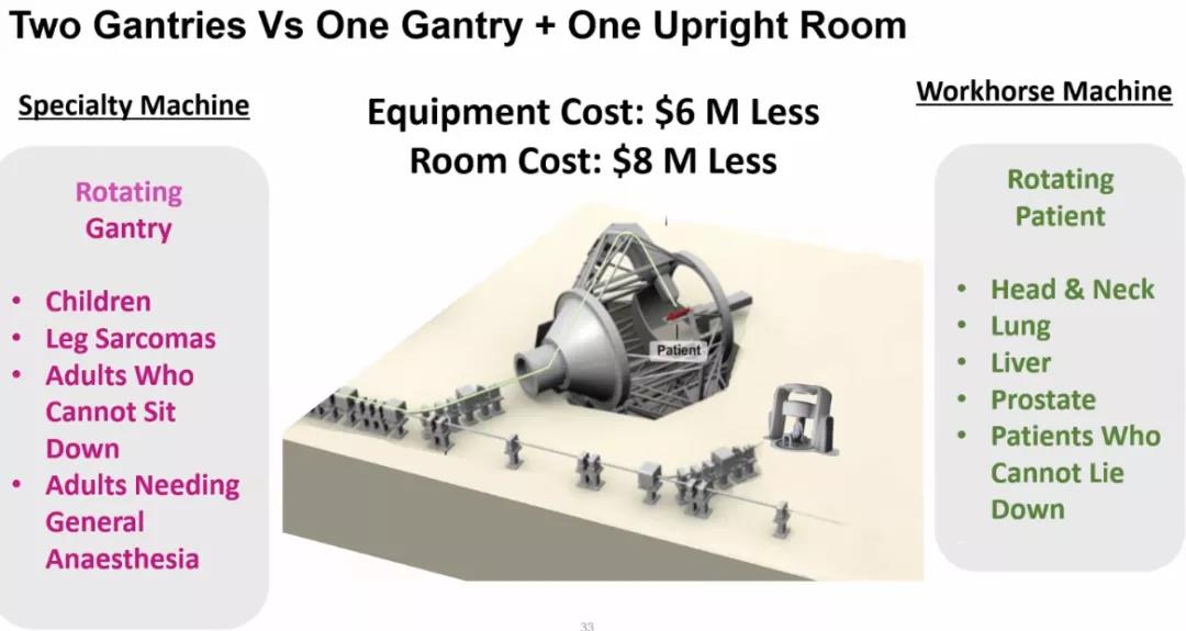 接下來,Rockwell Mackie教授比較了2個(gè)旋轉(zhuǎn)機(jī)架與1個(gè)旋轉(zhuǎn)機(jī)架+1個(gè)立式治療室的成本差異(假設(shè)二者的束流產(chǎn)生系統(tǒng)相同),后者的設(shè)備費(fèi)用可減少600萬美元,治療室的費(fèi)用則可減少800萬美元。