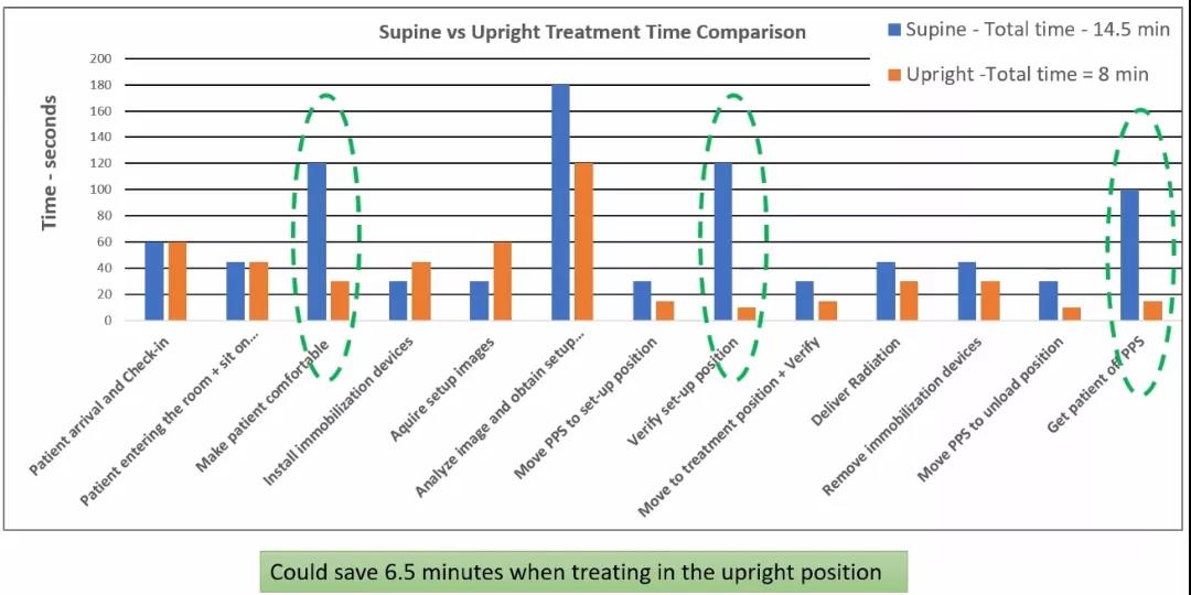 在時(shí)間成本方面,Rockwell Mackie教授比較了一個(gè)射野治療的情況下,立式治療與仰臥位治療的時(shí)間差異。立式治療所需的總時(shí)間為8分鐘,仰臥位治療的總時(shí)間為14.5分鐘;相比之下,立式治療可節(jié)約6.5分鐘。