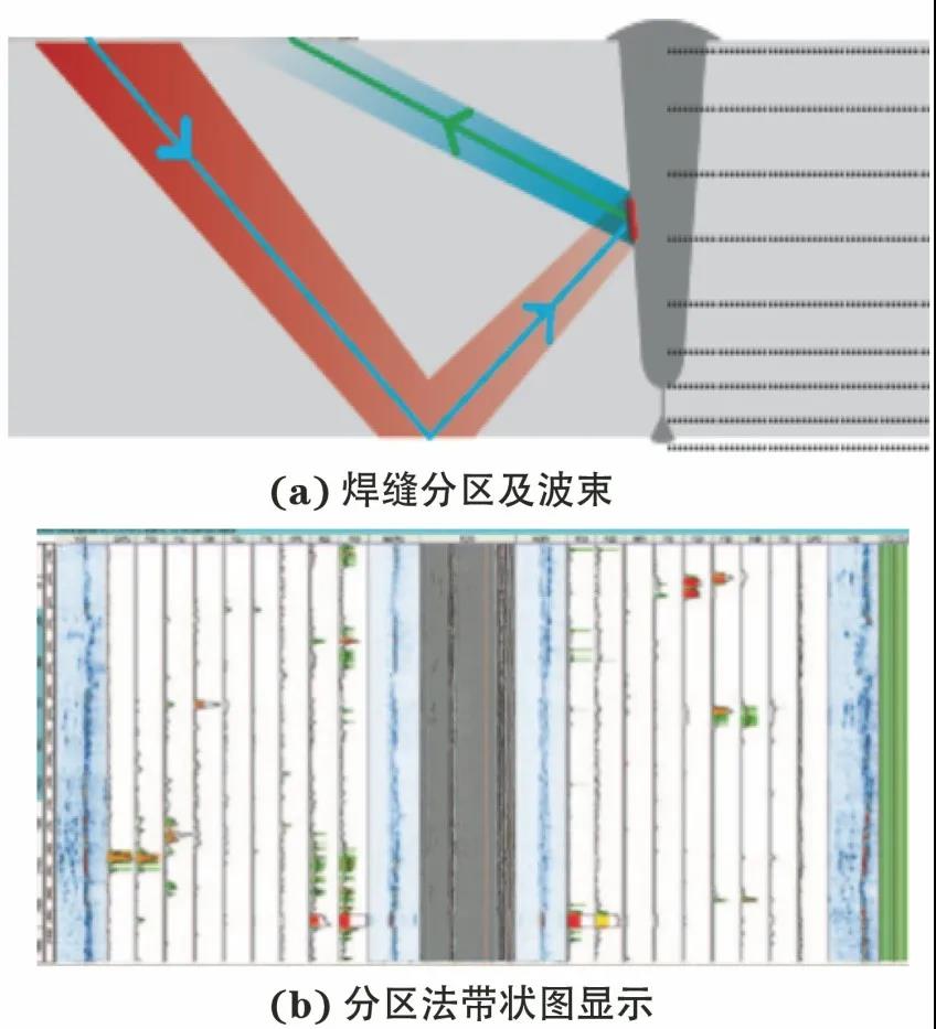 常規(guī)全自動(dòng)超聲(AUT)檢測技術(shù)采用分區(qū)法,將焊縫沿壁厚方向分成若干區(qū)域,如根部區(qū)、鈍邊區(qū)、熱焊區(qū)以及填充區(qū)等,分區(qū)高度為1~3mm,每個(gè)分區(qū)設(shè)置獨(dú)立的反射體,使用獨(dú)立的檢測波束對每分區(qū)分別進(jìn)行掃描,以A掃描-雙門帶狀圖的形式顯示(焊縫分區(qū),波束配置及圖像顯示見圖1)。