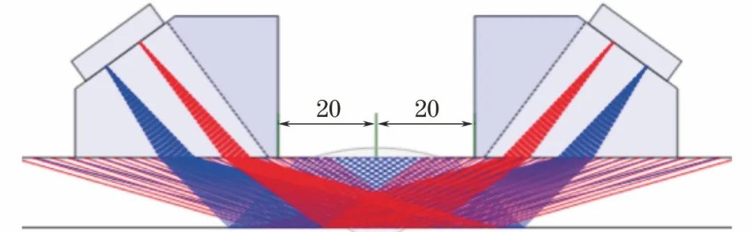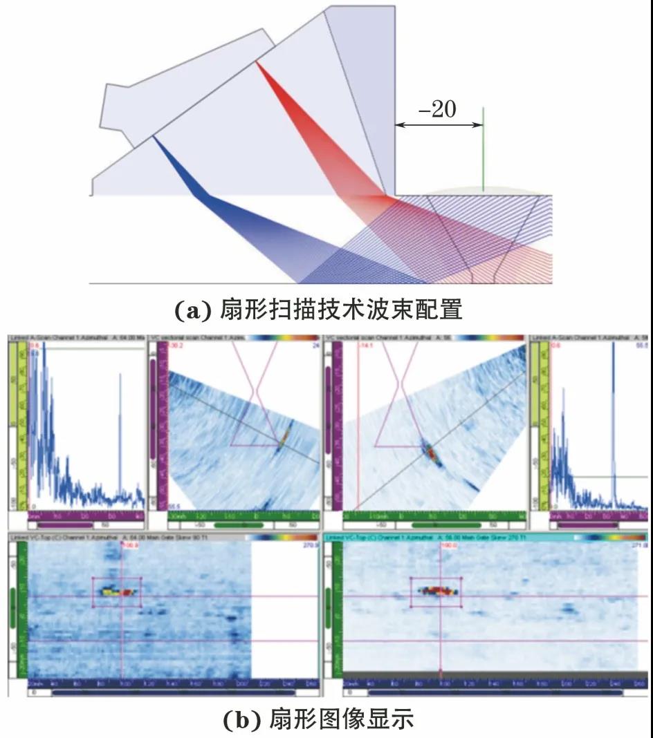 相控陣超聲扇形掃描工藝是基于相控陣檢測系統(tǒng),兩個(gè)相控陣探頭對稱布置于焊縫兩側(cè),設(shè)置一組波束覆蓋焊縫內(nèi)外表面及填充區(qū)域,設(shè)置第二組波束覆蓋根部區(qū)域,焊縫兩側(cè)采用相同的波束設(shè)置,采用機(jī)械掃查方式,實(shí)現(xiàn)焊縫檢測的過程。