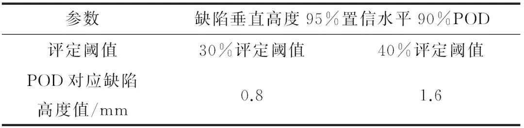由上表可以看出,在90%檢出率95%置信水平條件下,40%評(píng)定閾值,POD對應(yīng)缺陷高度值為1.6mm;使用30%評(píng)定閾值,POD對應(yīng)缺陷高度值為0.8mm,滿足標(biāo)準(zhǔn)對POD的極限值要求,為工程應(yīng)用提供了可靠保障。