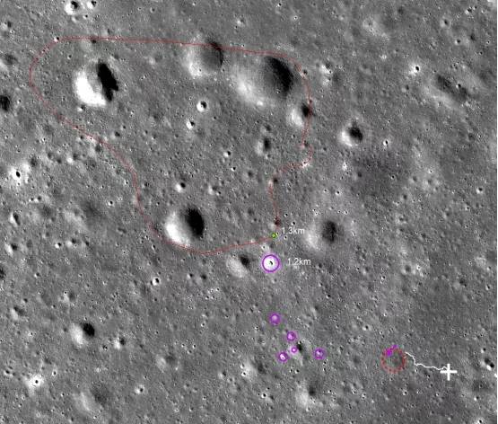 基于第22月晝全景相機拼接影像、DOM影像等數據情況,“玉兔二號”月球車在第23月晝期間先后向玄武巖分布區域和反射率較高的撞擊坑區域行駛,這兩個位置均位于月球車西北方向。在此行進路線中,紅外成像光譜儀對一直徑約為30cm的巖塊進行了光譜探測??蒲袌F隊正在對探測數據進行深入研究。