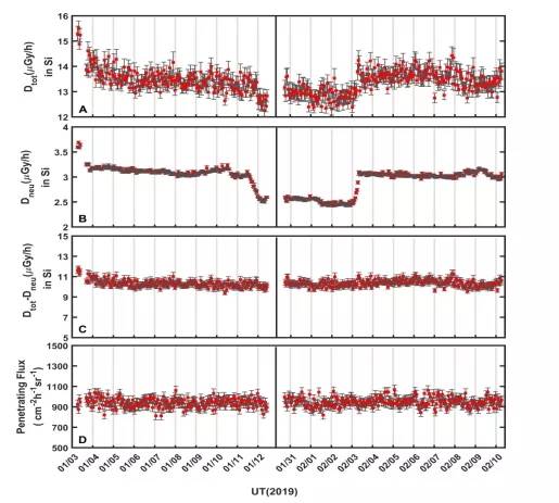 測量到的月表輻射劑量(橫軸為世界時,縱軸分別為:a 硅中的總輻射劑量率(微戈瑞/小時),b. 硅中的中性粒子輻射劑量率(微戈瑞/小時), c. 硅中的帶電粒子輻射劑量率(微戈瑞/小時),d. 宇宙線穿透粒子通量(個/平方厘米·小時·弧度)