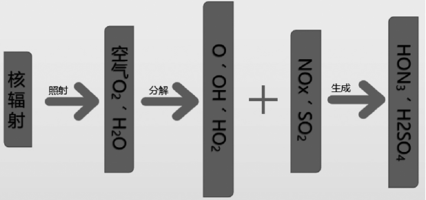 工業廢氣中含有大量的NOx、SO2,引入核技術,利用其輻射處理功能,能夠有效去除廢氣中的污染物質,同時還能得到有用的肥料。核技術在廢氣處理中的應用主要集中在電子束技術方面。具體的輻射處理過程示意圖見圖1。