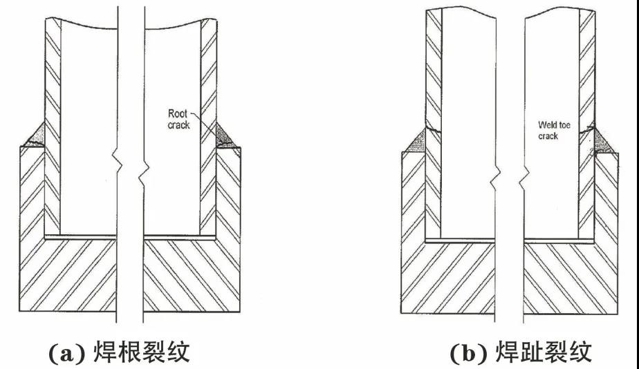 02 在長期服役過程中,低周疲勞作用易導致從內向外擴展的焊根裂紋或從外向內擴展的焊趾裂紋(見圖2);