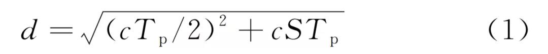 盲區(qū)深度為d,聲速為c,探頭中心距為2S,直通波的傳輸時間TL=2S/c,直通波脈沖時間寬度Tp可從振幅的10%處截取得到,一般情況下取直通波兩倍周期,則盲區(qū)的深度d可按下式算出: