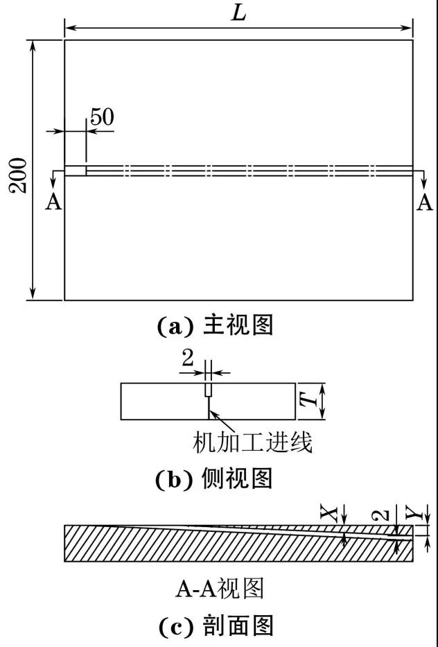 制作方法及要求:加工如圖1所示的人工缺陷試塊,試板厚度T不小于20mm,對比試塊應選用聲學性能與工件相同或相似的母材。采用電火花數(shù)控線切割機床從鋼板下表面向鋼板上表面切割一個矩形槽,矩形槽高度為2mm,矩形槽的長度不小于100mm,矩形槽缺陷距離鋼板上表面最小高度為0mm,最大高度Y不小于10mm,且該矩形槽與鋼板上表面成一定夾角X(推薦夾角為2°~8°)。需要保證人工缺陷與試塊上表面夾角X為已知角度,以便于后期的驗證計算。