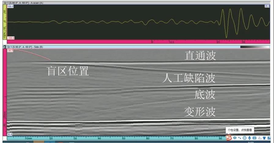 圖3 探頭中心距為60mm的掃查面盲區(qū)