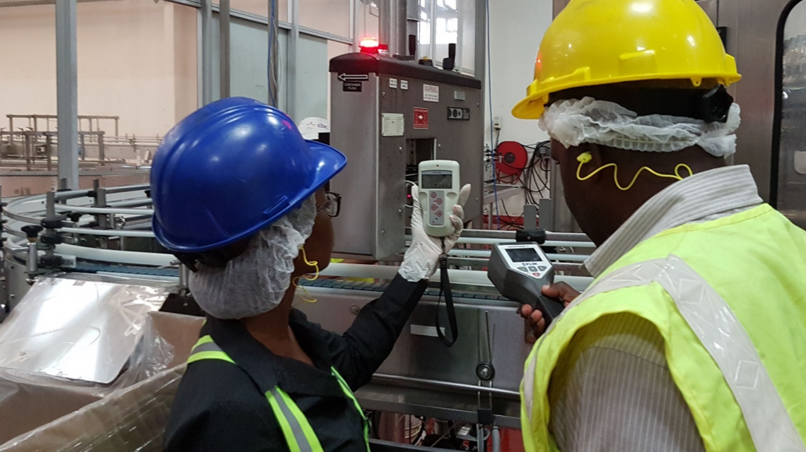 兩名HSRA工作人員從牙買加金斯敦的百事可樂裝瓶有限公司的X射線液位計(jì)上讀取讀數(shù)。(照片:HSRA)