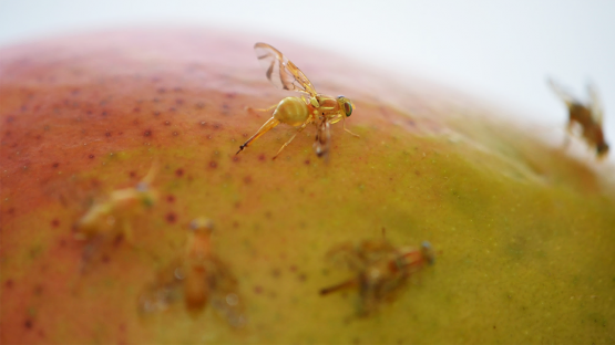 墨西哥雌果蠅(Anastrepha ludens)準(zhǔn)備將卵產(chǎn)入芒果。(照片:V。Dias /糧農(nóng)組織/原子能機(jī)構(gòu))