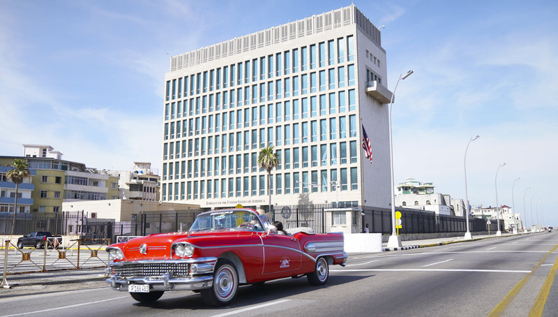 2019年,一輛汽車駛過美國駐哈瓦那大使館。近年來,在美國駐古巴和中國的外交使團工作的數十名美國人患有各種疾病,包括頭痛,平衡問題和記憶力減退。