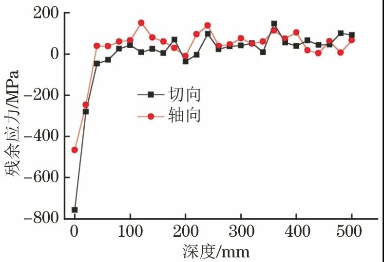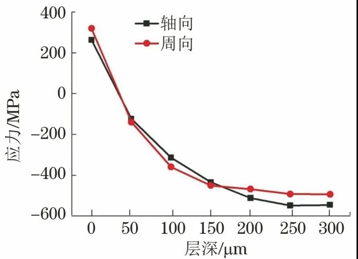 此外,筆者測試了以車代磨(硬態(tài)切削)加工工藝的殘余應(yīng)力分布,結(jié)果如圖3所示。