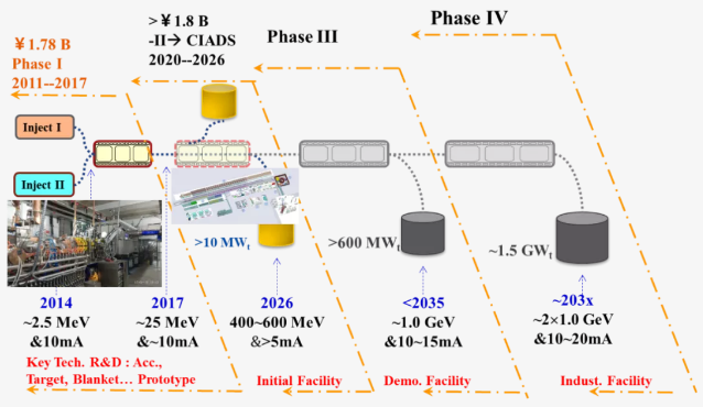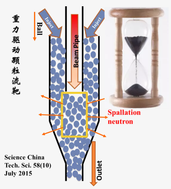 為實現ADANES的愿景、解決面臨的多個方面的核心技術挑戰,中國制定了發展路線圖(圖1)。中國科學院科技先導A類專項支持了I期裝置的建設調試,取得了突破性進展、驗證了技術路線的可行性,目前發改委已經批準第二期項目加速器驅動嬗變實驗裝置(CiADS)的建設。在I期建設中實現了多項關鍵技術突破并將在后續建設中繼續攻關:完成了連續波型超導直線加速器樣機設計、集成與調試,獲得最高功率的連續波束流,調試水平達到國際領先;受沙漏的啟發,創新性的提出了顆粒流靶(圖2)的設計思想,大幅提高靶的功率承受能力,使功率超過10MW的系統設計成為可能;提出了低次級沾污高溫干式處理的再生乏燃料組合新方法,大大減少核廢料的產生并降低核擴散的風險;高溫陶瓷反應器的設計使得燃燒器系統更加安全;為滿足新型靶及先進核能相關系統的設計要求,全新開發了基于GPU和超算的模擬程序,為完成創新方法的驗證與系統設計提供了重要的平臺,同時為實現數字化ADANES提供助力。